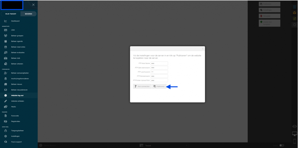 Hiervoor dien je zelf een domeinnaam met webruimte te voorzien. Een basis hostingpakket is hiervoor meer dan voldoende, bijvoorbeeld bij Combell of One.com. Na aankoop ontvang je van je hosting provider FTP-gegevens. Daarmee kun je je Twizzit-website op je domeinnaam publiceren.